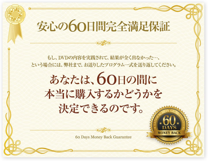 もし、DVDを購入して頂き、今よりも技術的なスキルが上がらない、或は実践したにも関わらず効果がみられないということであれば、弊社商品発送日から60日以内(必着)であれば、全額返金します。