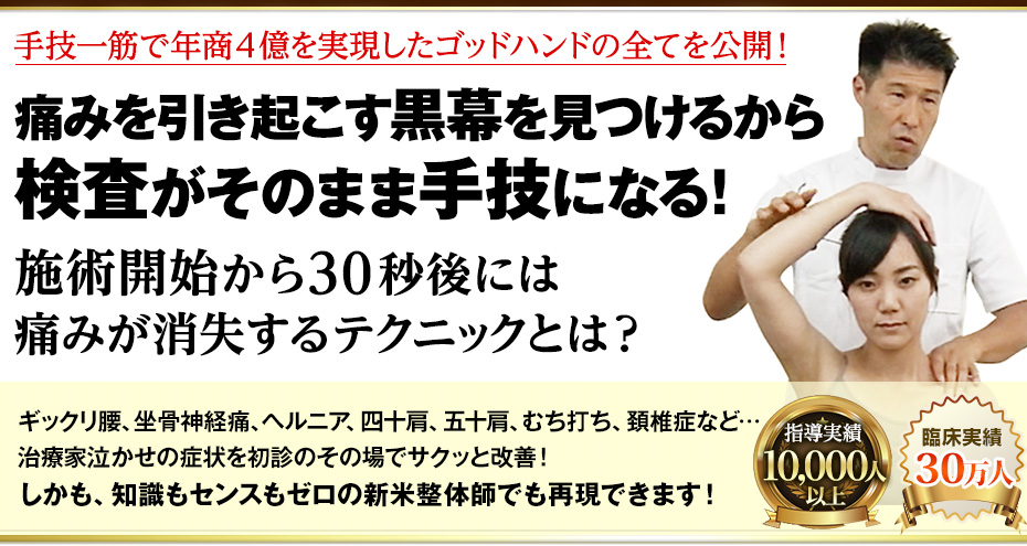 この度、包まれていたベールを脱ぎ、重症な腰痛や首肩の関節痛の患者さんでもサクッと治してしまう手技テクニックを公開してくださいます。