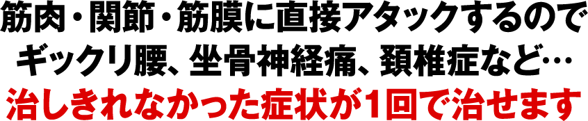 ギックリ腰、重度の腰痛、坐骨神経痛、ヘルニア、四十肩、五十肩、むちうち、頚椎症など…