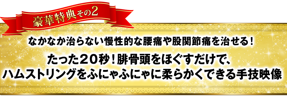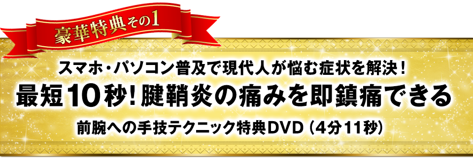 施術後、「まだ、痛みが残ってます・・・」と言われて気まずい空気になることがありませんか? この特典DVDでは、腱鞘炎による親指の痛みを解消するテクニックが3つも紹介されているので、 患者さんから、「まだ痛い・・・」とイチャモンを付けられる心配をすることなく、「絶対治せる!」と自信を持って施術することが出来ます。