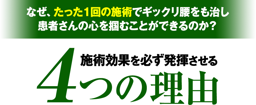 この手技をほんの数分取り入れただけで、痛みに悩んでいる患者さんの症状を初診のその場で解消することができ、患者さんの心を掴め自然とクチコミが起き繁盛していったのです。