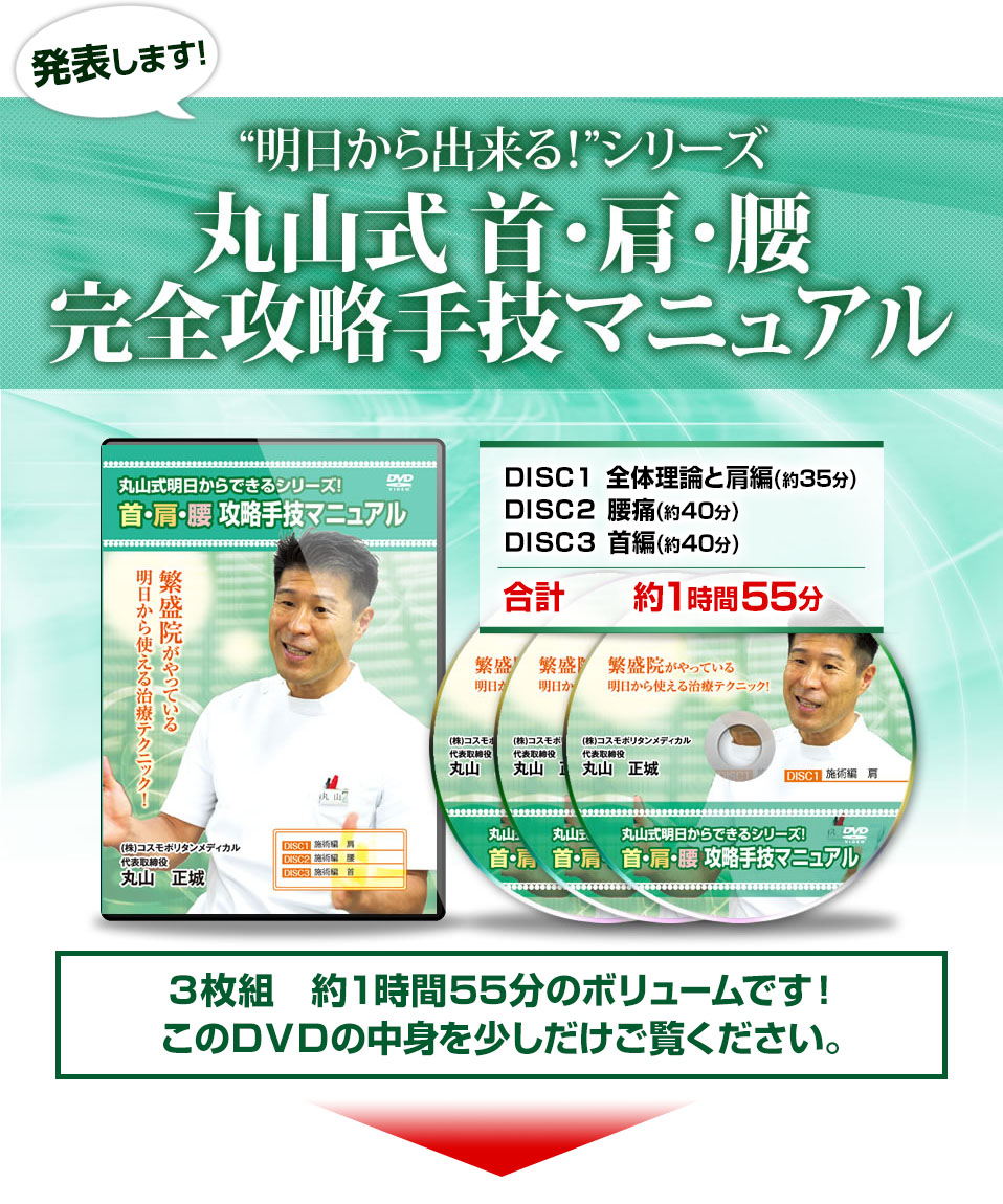 丸山先生のノウハウの特長は明日から使える程の再現性の高さにあります。現場経験ゼロの新米スタッフでもこのDVDを見れば、すぐにでも試してみたくなる技術が満載です。実際に丸山先生の技術を学んだスタッフ達は患者さんの取り合いをしているほどです。
